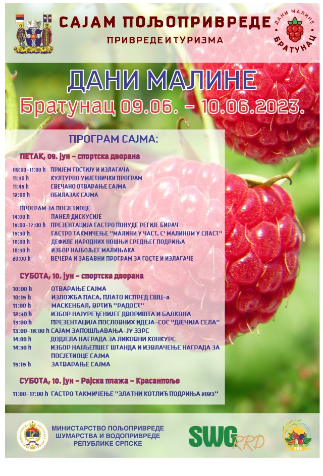 Povodom 15. Međunarodnog sajma poljoprivrede, privrede i turizma „Dani maline 2023“ koji će se ove godine održati 9. i 10. juna u Bratuncu, predstavljen je i zvanični program.