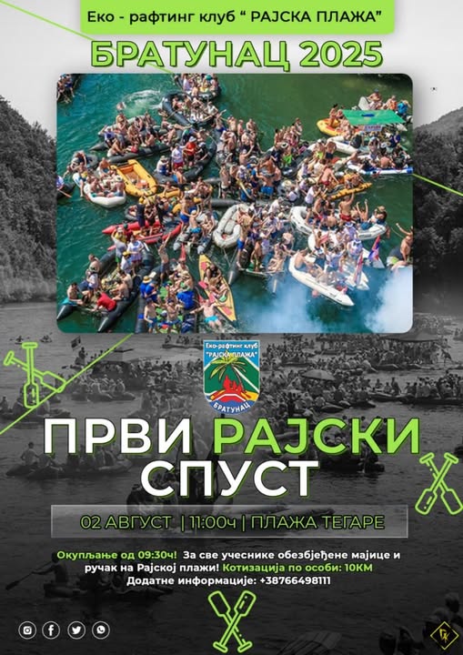 Eko-rafting klub „Rajska plaža“ organizuje prvi "Rajski spust", koji će se održati u subotu, 2. avgusta 2025. godine.