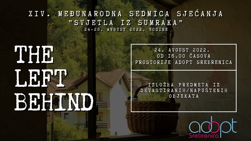 Izložba pod nazivom "The left behind" biće otvorena u 16 časova u prostorijama Udruženja Adopt Srebrenica . Izložba je konceptualan prikaz predmeta i materijala pronađenih u devastiranim privrednim i porodičnim objektima u Srebrenici. Kroz različite neprilike koje su zadesile stanovništvo u Srebrenici, isto je, napuštajući objekte u kojima su boravili, iza sebe ostavljalo predmete korištene u svakodnevnoj upotrebi, koji su potom znali biti predmet destrukcije, krađe ili prenamjene u druge svrhe.