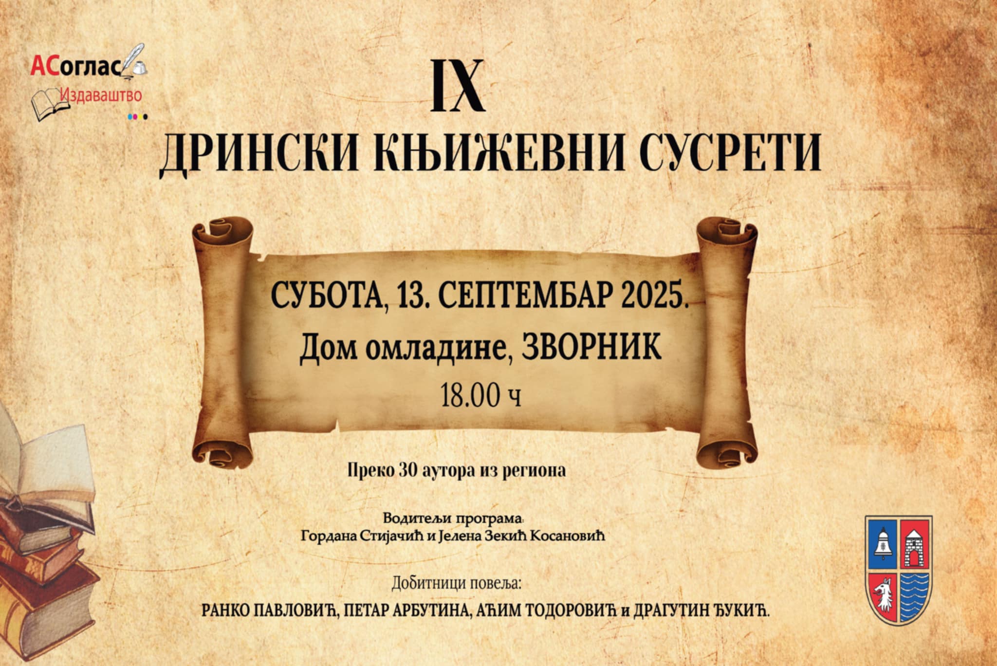 U subotu,13.septembra u Domu omladine u Zvorniku sa početkom u 18 časova biće održani 9.Drinski književni susreti.