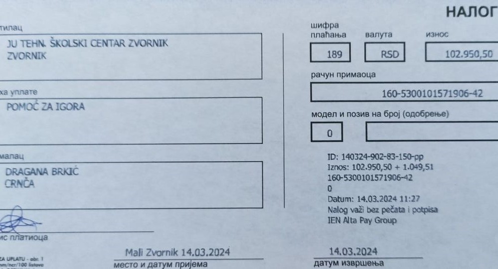 Kako su naveli iz ove škole ,novac je uplaćen na ime Dragane Brkić, majke Igora Brkića(16) iz Crnče kod Ljubovije koji vodi najveću bitku u svom životu. Zbog operacije tumora na mozgu trenutno se nalazi na lečenju u Turskoj a troškove od 35.000 evra porodica treba što pre da uplati.