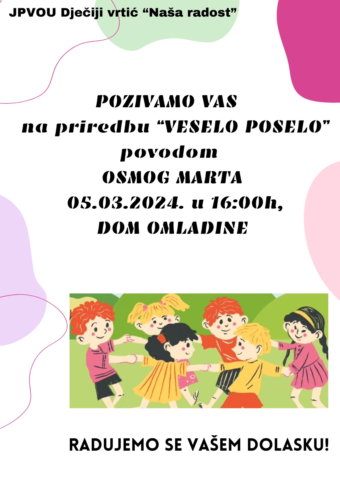 Dječiji vrtić”Naša radost” Zvornik danas u 16 časova u Domu omladine organizuje Veselo poselo, povodom 8. marta,Dana žena.