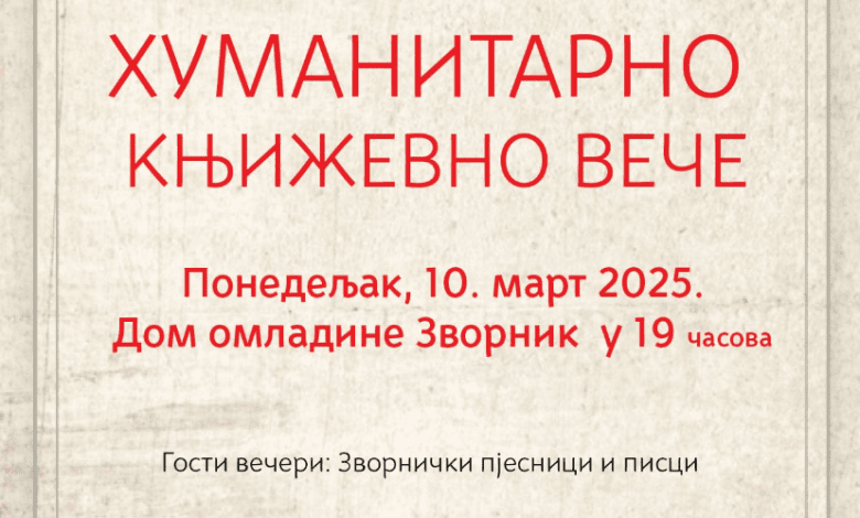 Humanitarno književno veče na kojem će učestvovati zvornički pisci i pesnici održaće se u Domu omladine u Zvorniku u ponedeljak 10. marta 2025. u 19 časova.Knjige su pored autora koji će tu veče da nastupe donarali i drugi autori i time doprineli ovoj humanitarnoj večeri.