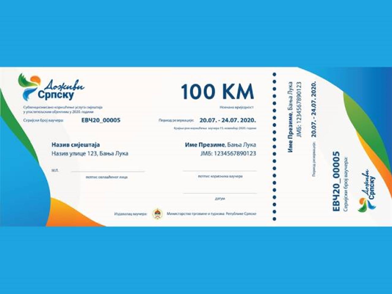 U Republici Srpskoj od danas je moguće korištenje turističkih vaučera u vrijednosti od 100 KM za plaćanje usluge smještaja noćenje sa doručkom, bez obzira na vrijednost izvršene usluge smještaja, saopšteno je iz Ministarstva trgovine i turizma Republike Srpske.