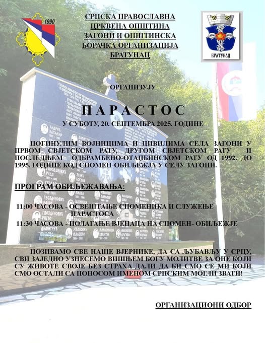 U selu Zagoni, opština Bratunac, u subotu 20. septembra 2025. godine biće održano osveštanje spomenika i parastos poginulim vojnicima i civilima iz ovog mjesta u Prvom i Drugom svjetskom ratu, kao i u Odbrambeno-otadžbinskom ratu 1992–1995. godine.