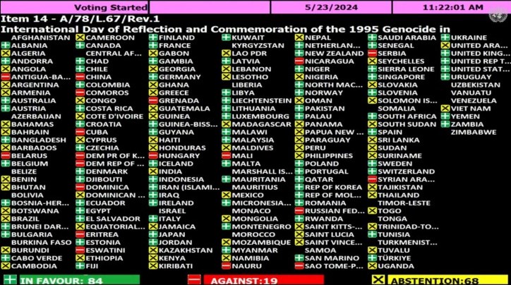 Iako je na Generalnoj skupštini UN, promjenom pravila usvojena rezolucija o Srebrenici, 109 zemalja suštinski nije podržalo rezoluciju.