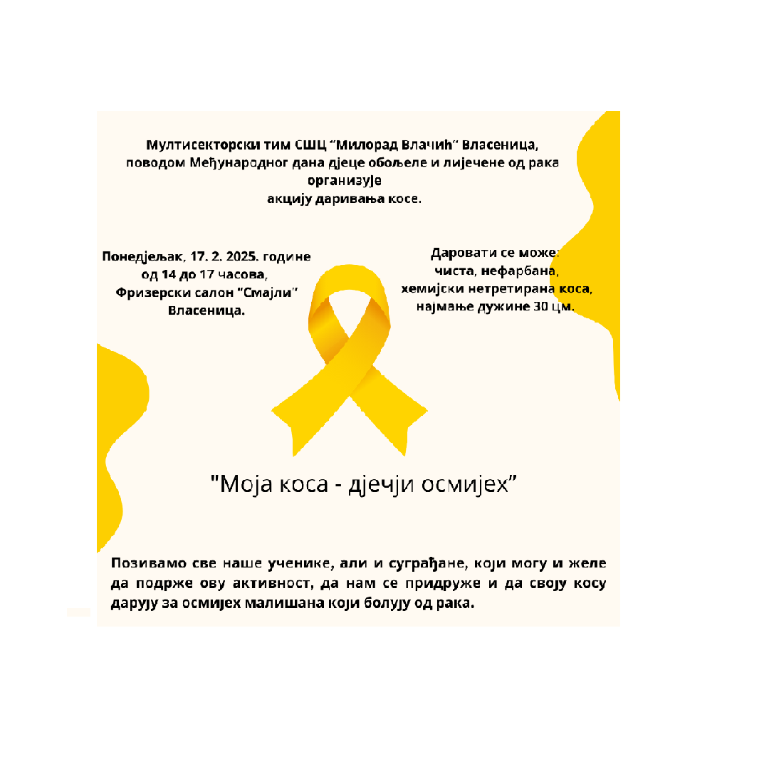 Upućen je pozivod strane orgnaizatora svim učenicima i Vlaseničanima, koji mogu i žele da podrže ovu aktivnost, da se pridruže i da svoju kosu daruju za osmijeh mališana koji boluju od raka.