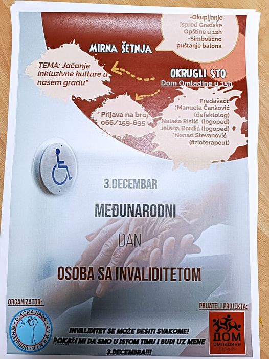 Povodom obilježavanja Međunarodnog dana osoba sa invaliditetom,3.decembra ,Udruženje “Dječija nada” iz Zvornika danas i sutra organizuje niz aktivnosti .