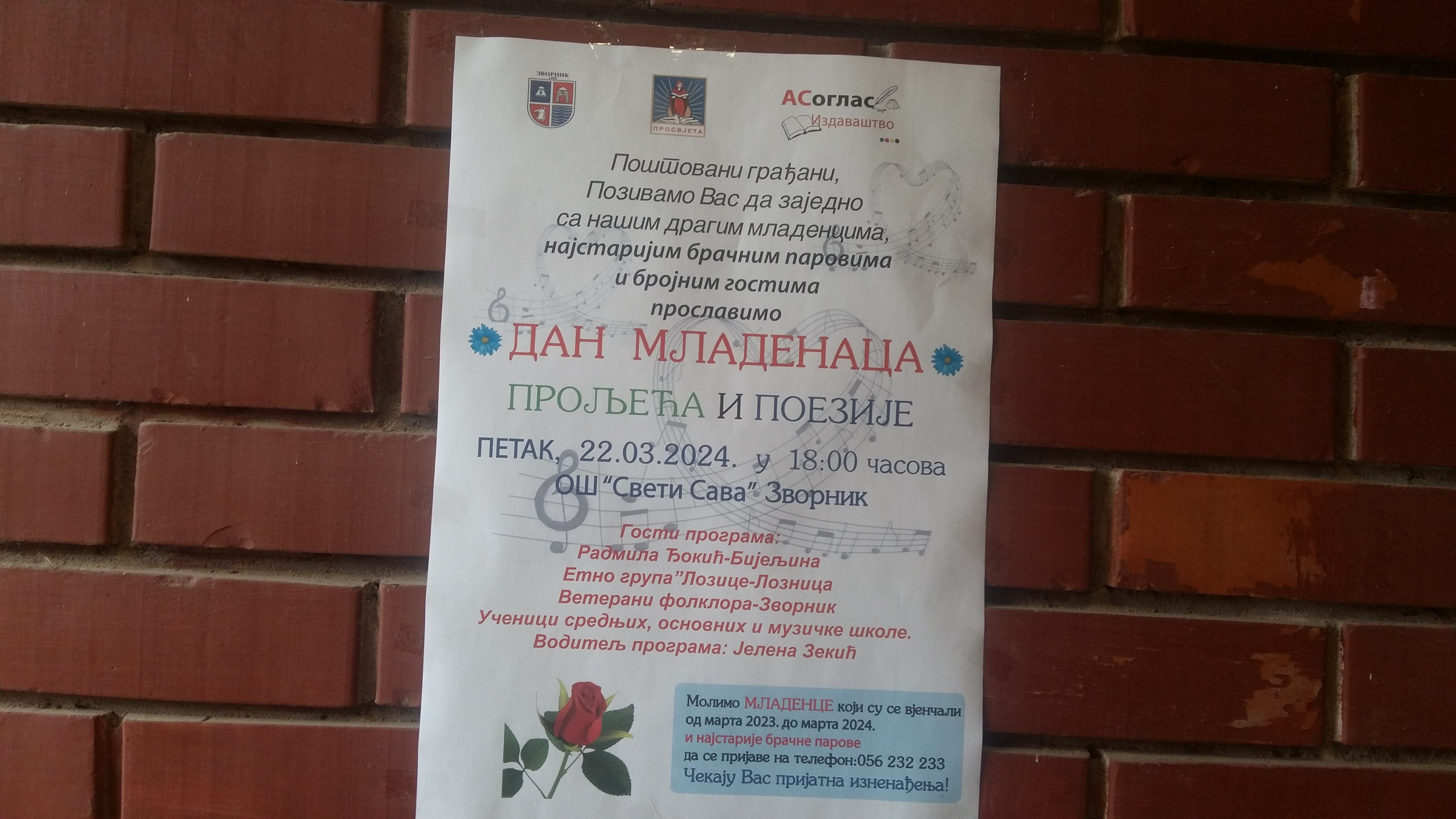 U organizaciji Srpskog prosvjetnog i kulturnog društva “Prosvjeta“ i pod pokroviteljstvom Grada Zvornika, u petak,22.marta biće održano tradicionalno Poetsko i muzičko veče posvećeno prazniku Mladenci, Svjetskom danu poezije i dolasku proljeća. Manifestacija u holu Osnovne škole “Sveti Sava”zakazana je za 18 časova .